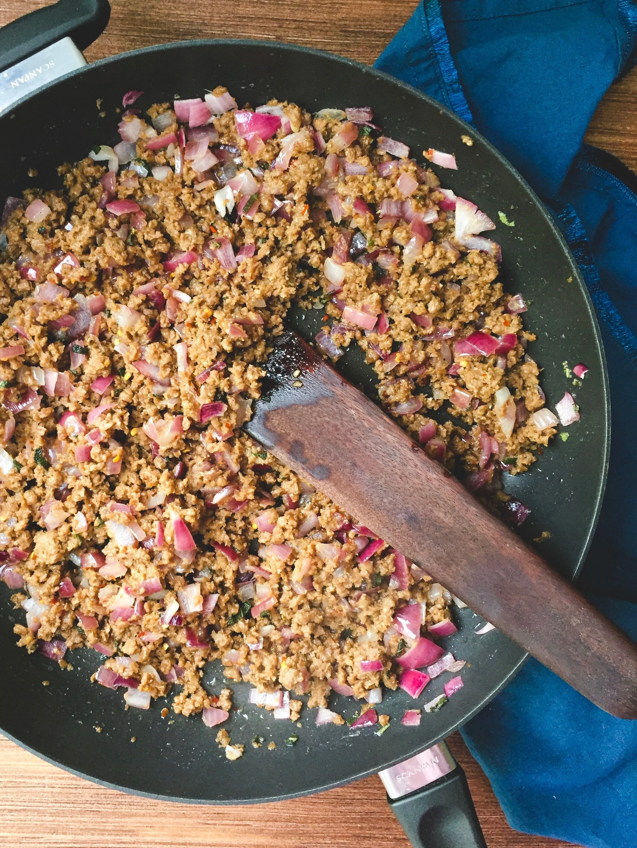 You may be tempted to use a newer, shinier meat replacement than Lightlife crumbles (like beyond meat). I tried using Beyond Meat last year and it didn’t work as well. Lightlife crumbles have a more neutral taste, whereas Beyond definitely tastes like beef. Feel free to sub whichever brand of faux ground meat you prefer, but keep in mind we want it to take more like pork than beef.