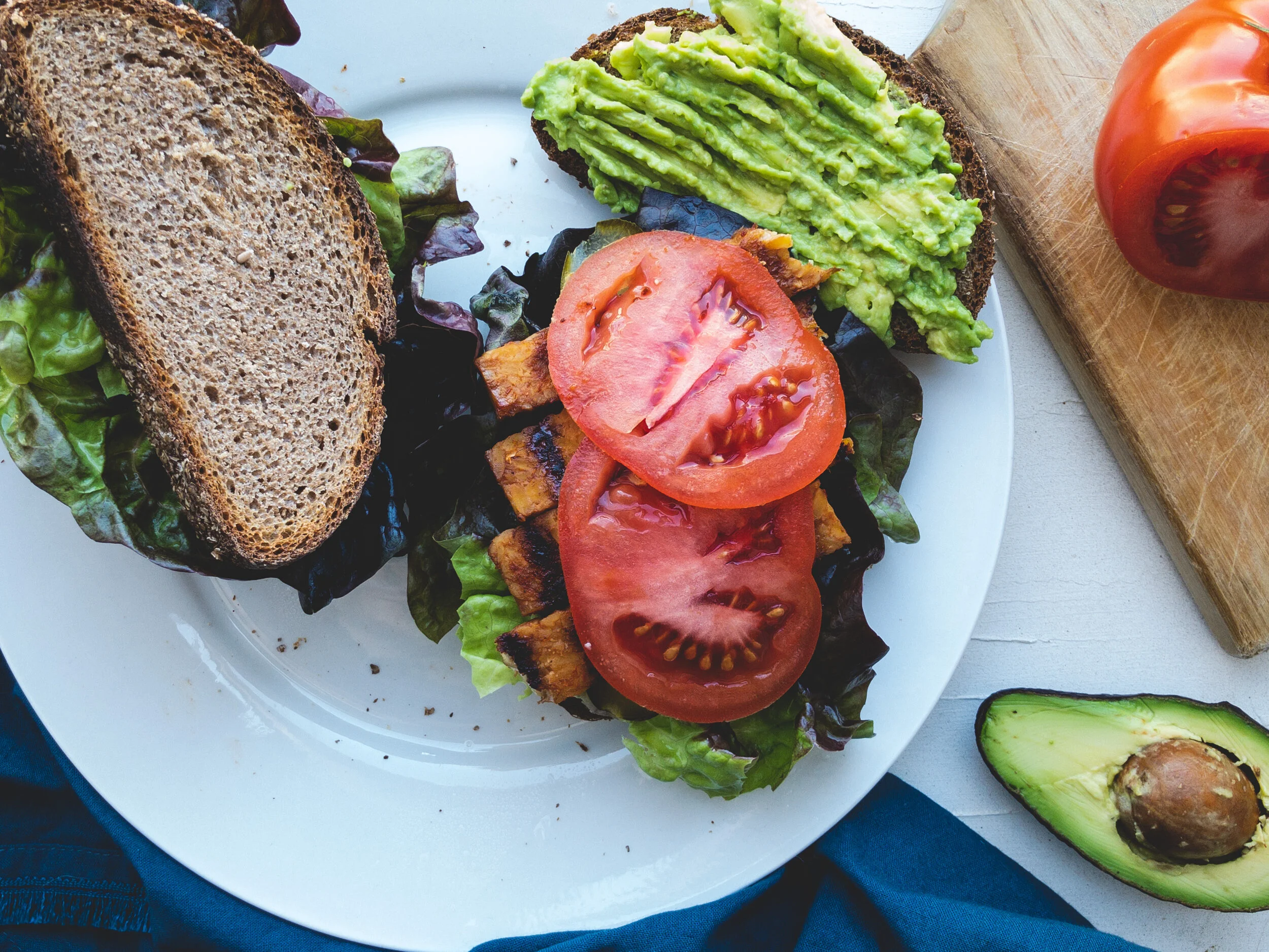 - Build your sandwiches by layering sliced tomato, tempeh bacon, lettuce, and any other additional toppings you desire, between one slice of avocado bread and one slice of dijon mustard bread.