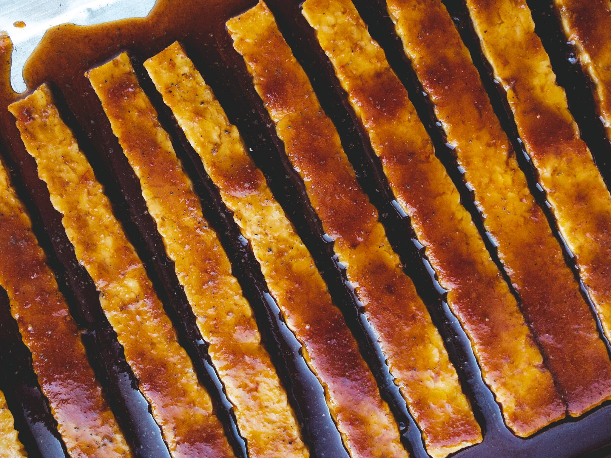 - Place the thinly sliced tempeh in a large, shallow dish or small baking sheet with raised edges.