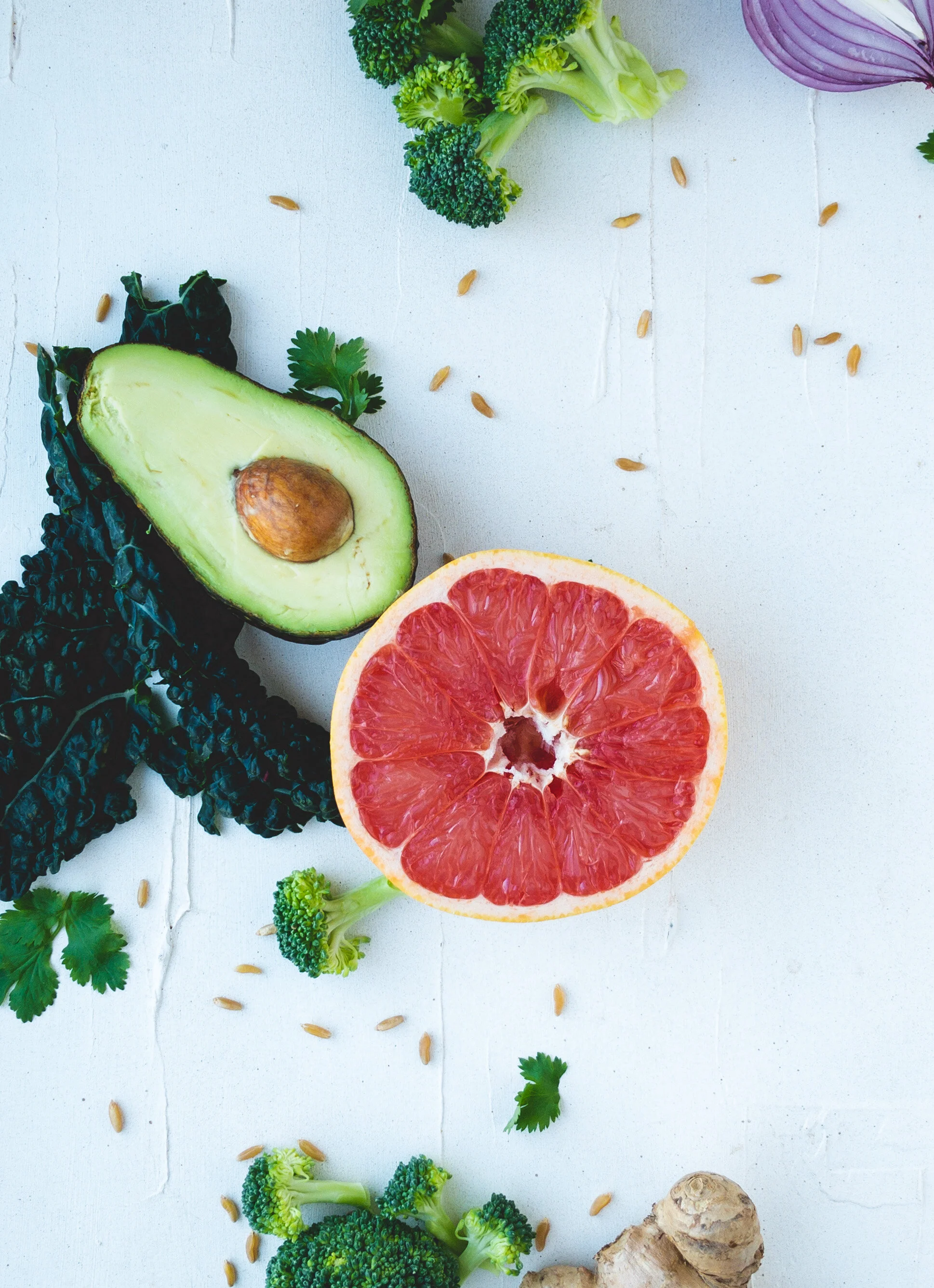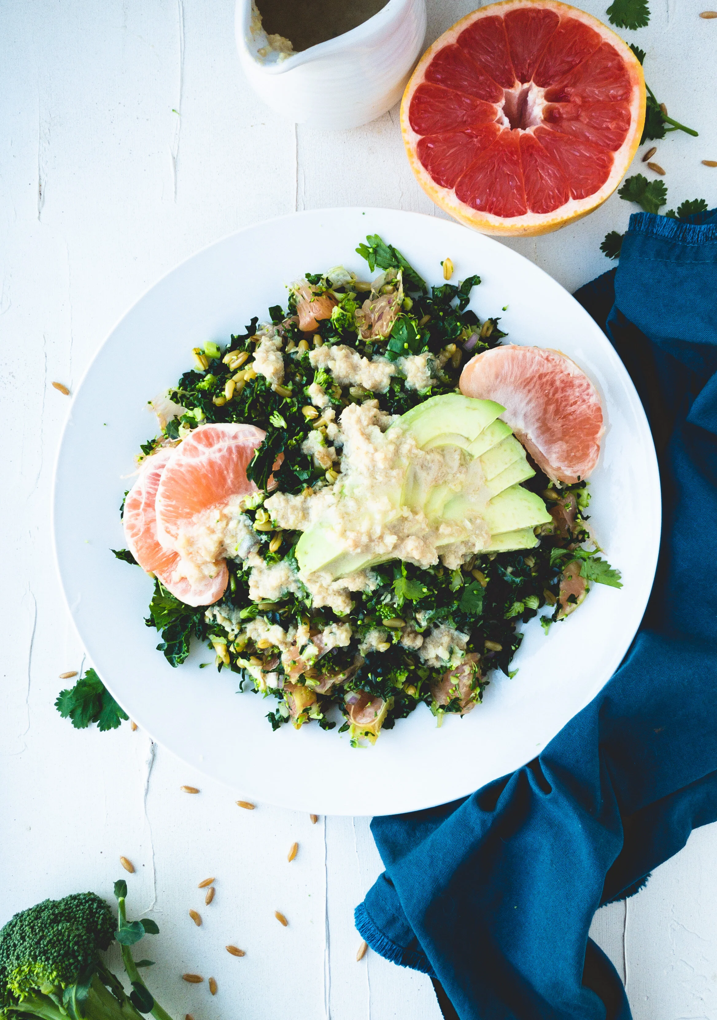 I first tried kamut in college in this TO DIE FOR mediterranean salad that, sadly, gets a lot of flavor from feta and copious amounts of olive oil. I’ve been excited to find a way to use it that wouldn’t depend on processed fats and dairy as a flavor crutch. In this salad, the kamut provides a hearty and chewy base for the bright flavors of grapefruit, cilantro, and ginger, while getting a whollup of phytochemicals (including sulforaphane) from the broccoli and kale. No oil or feta needed!