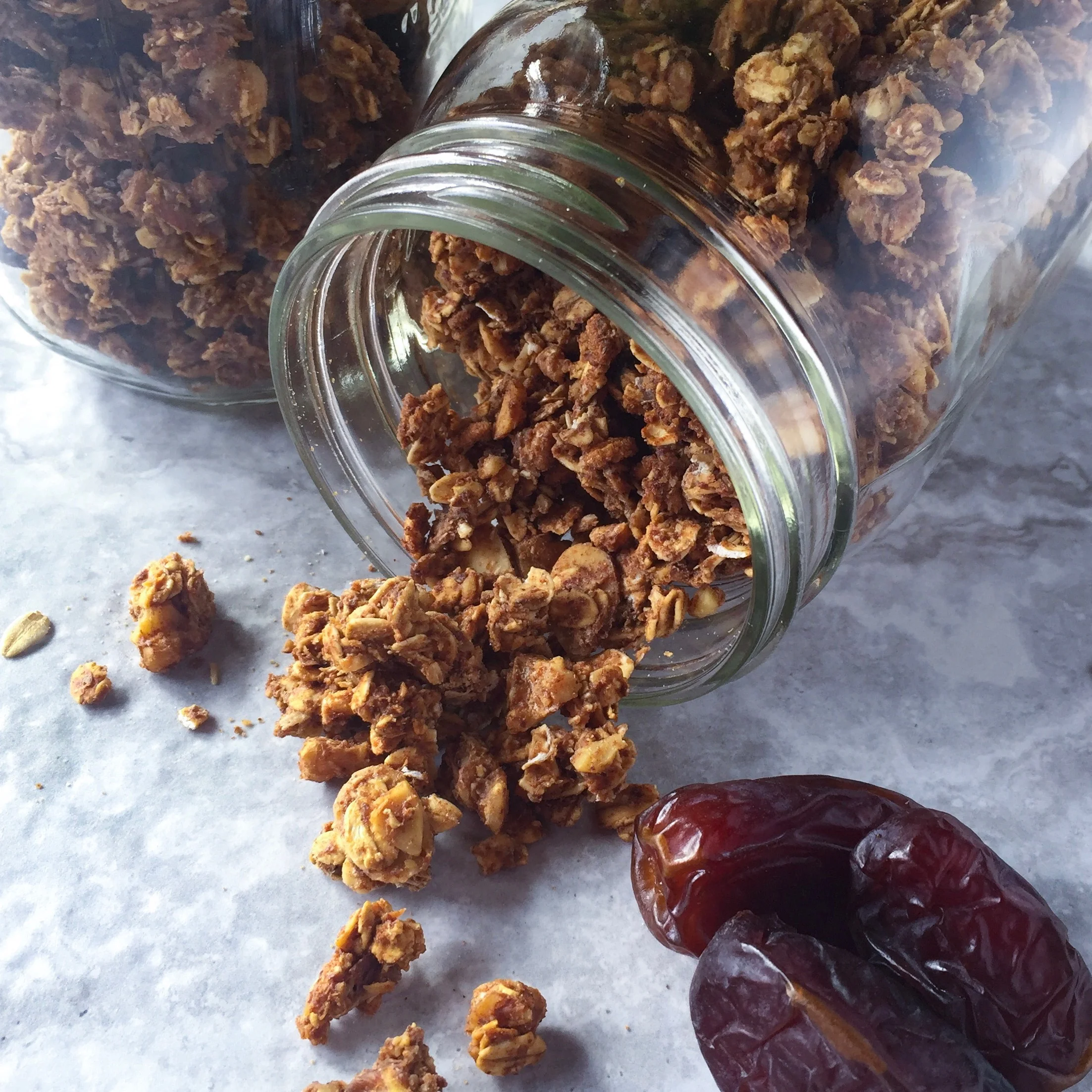 Filling, delightfully crunchy granola that is oil-free, date-sweetened, and gluten-free! Packed with fiber from oats and omega-3s from walnuts, it's the perfect addition for a child's breakfast, a snack on the trail or the slopes, or a post-workout meal with your favorite fruit. Ready in under 1 hour.