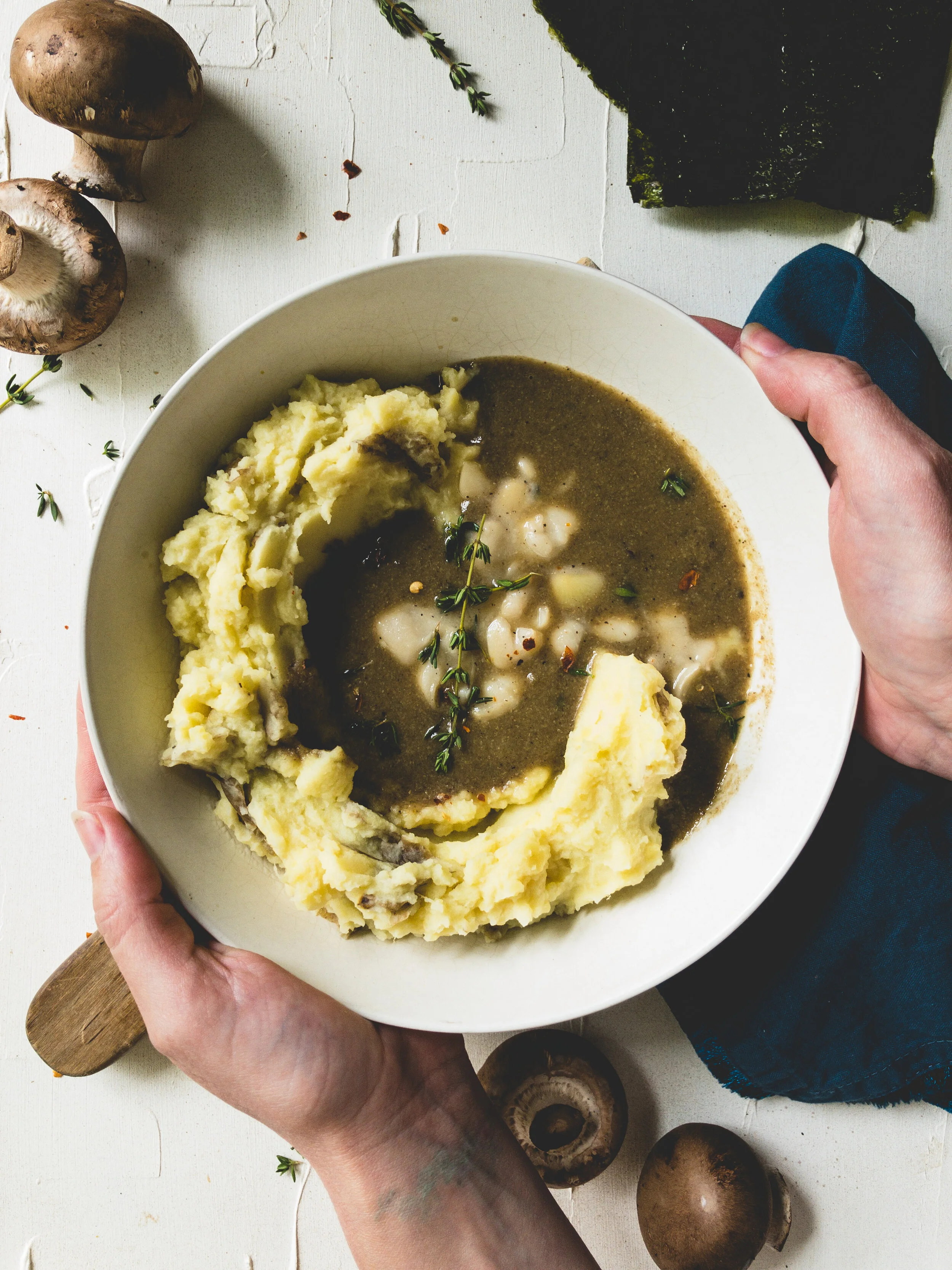 Click here for the recipe for my MASHED POTATO AND MUSHROOM GRAVY BOWL WITH LEMONY BUTTER BEANS (pictured above).