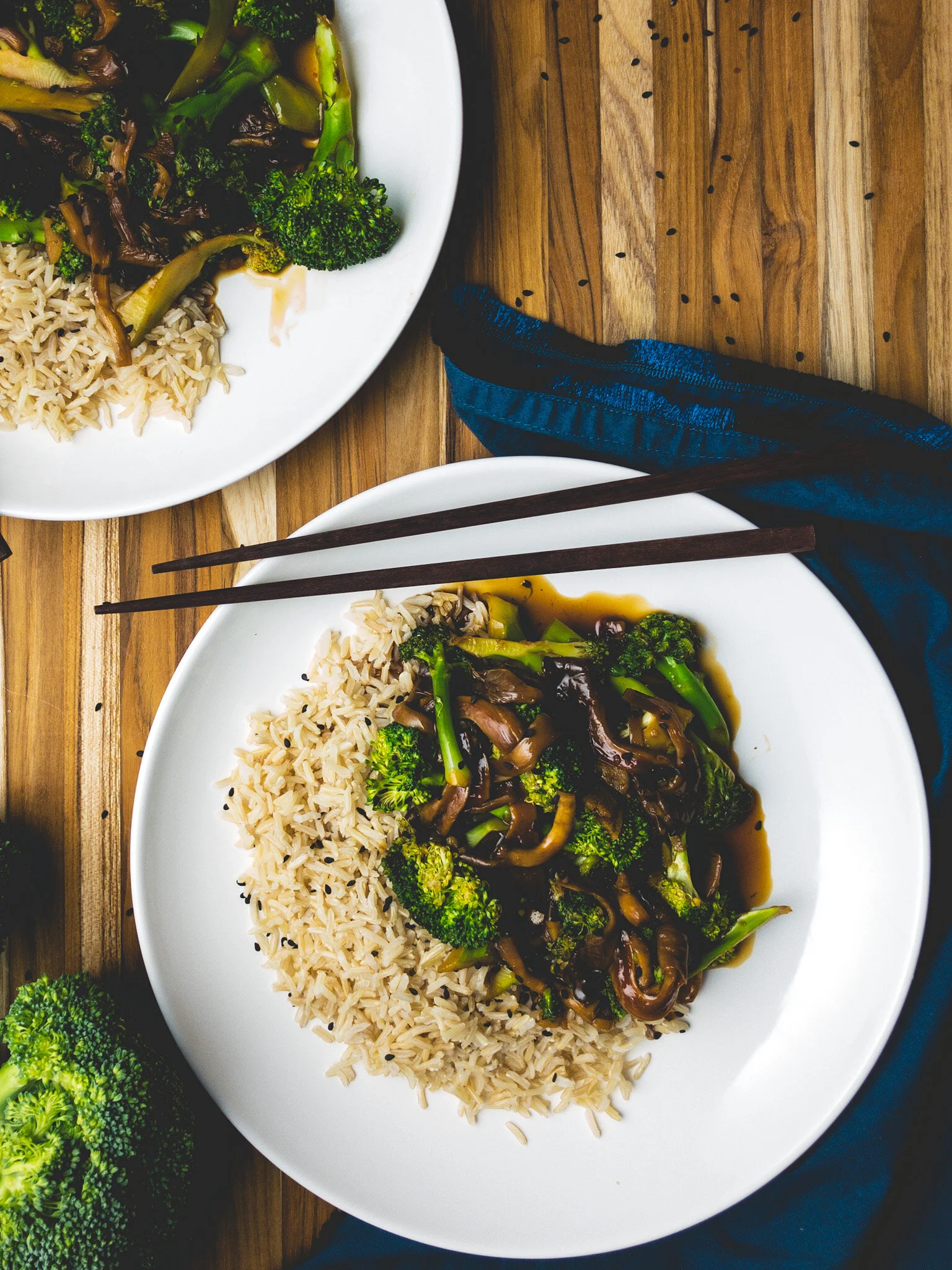 Whip up this simple Vegan Broccoli and Beef meal for two on a night when you're craving something quick, comforting, AND nutritious. Oyster mushrooms make a great swap for beef with their meaty texture, lower carbon-footprint, and low caloric density. Enjoy this flavorful oil-free dish over a fluffy bed of rice and a sprinkle of sesame seeds.