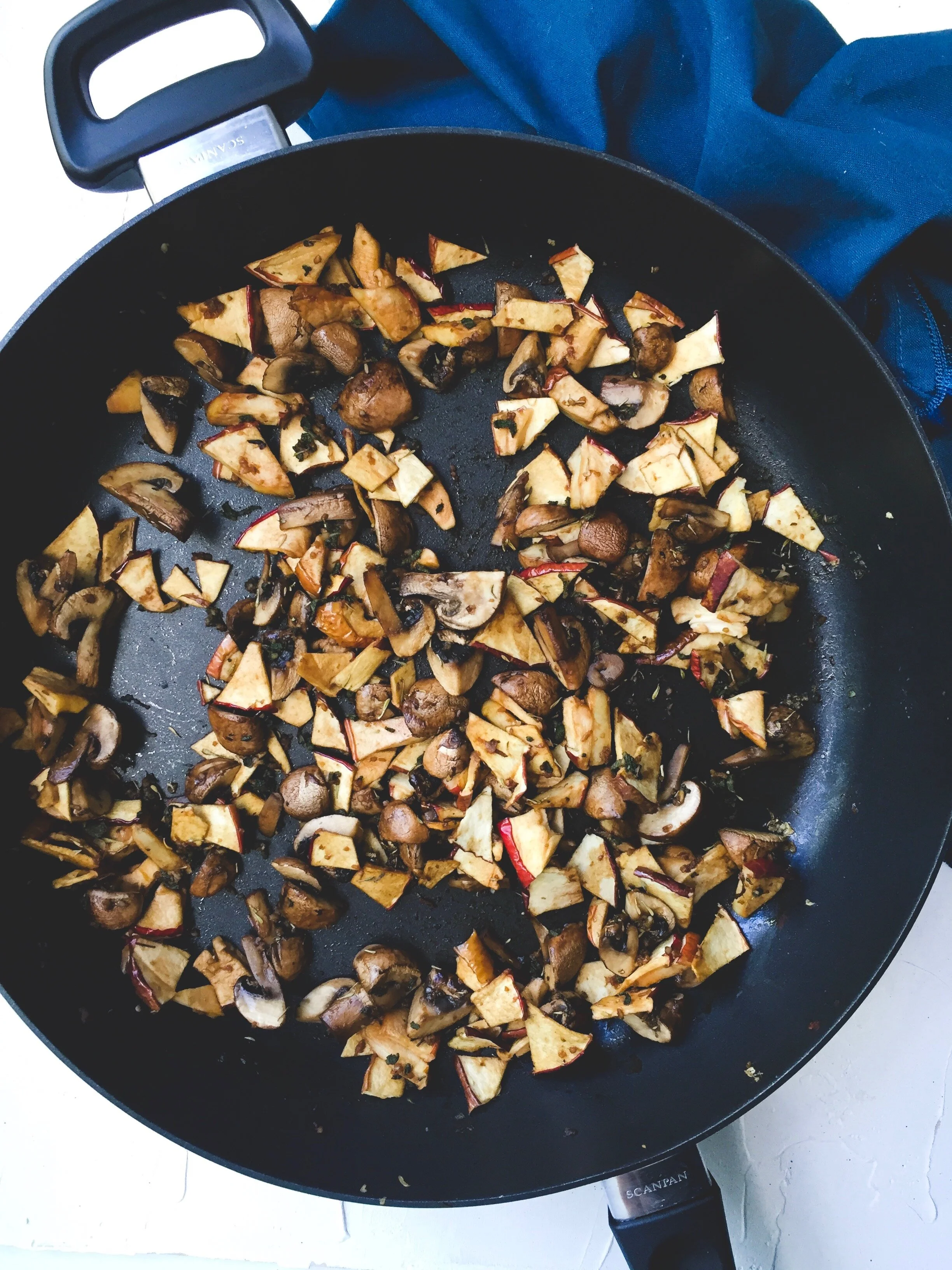 - Next, add the quartered mushrooms, dried apple, sage, and garlic to the pan. Cook, stirring occasionally, until the mushrooms have browned (about 3 minutes).